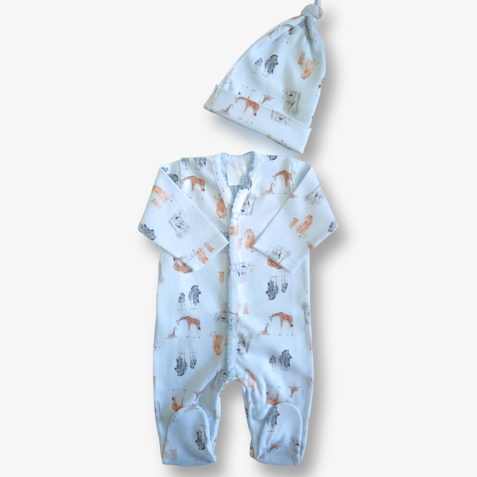 Conjunto Enterito y Gorro para prematuro hipoalergénico en algodón pima con terminación picot, en color celeste con estampado. Este conjunto está confeccionado en una calidad superior de algodón que tiene la fibras más finas y más largas, considerado el mejor algodón del mundo por su suavidad, durabilidad y resistencia. El algodón pima es ideal para los bebes, ya que ayuda a mantener la temperatura de su cuerpo, es hipoalergénico, extrasuave, no se encoje, no se deforma y se mantiene muy bien tras los lavados.
